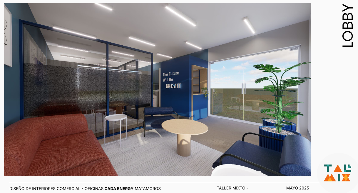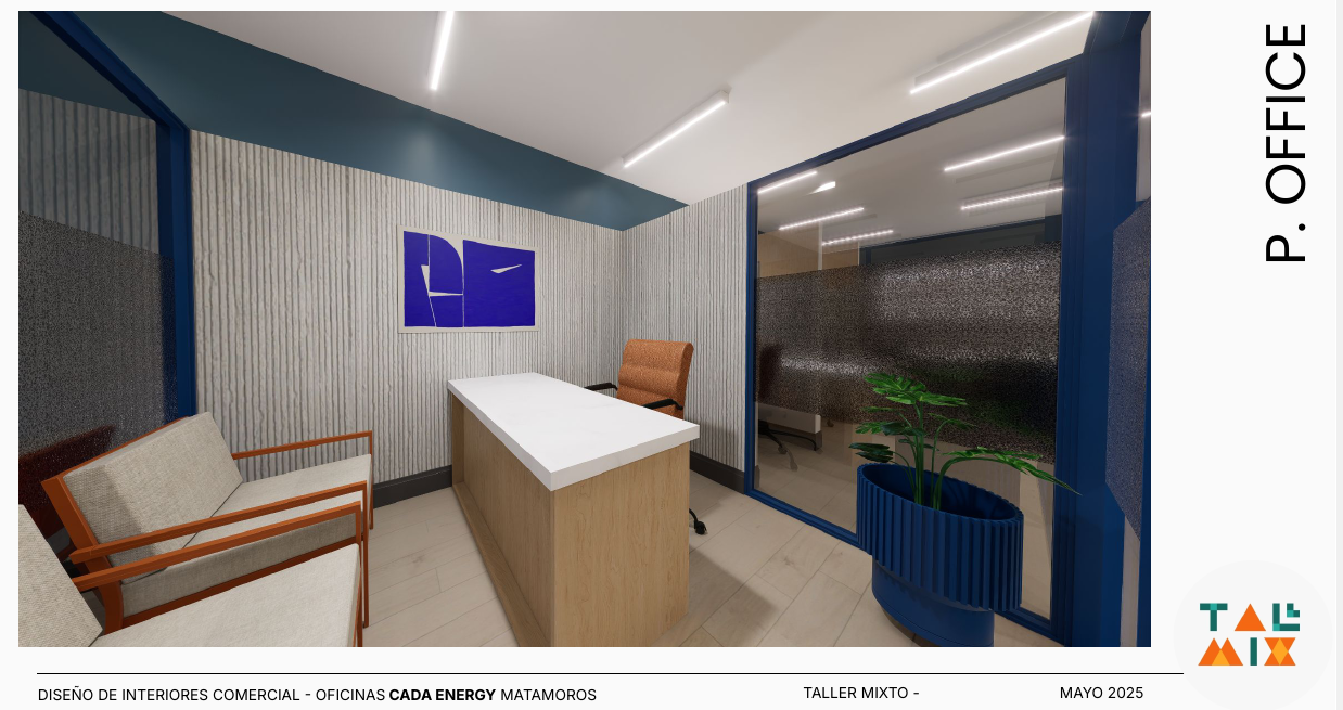 Este proyecto en Matamoros, Tamaulipas, será oficina de un equipo multidisciplinario y multigeneracional que se transforman de un formato --home office a presencial. Nuestros clientes buscaban un espacio cálido y creativo que represente los colores y valores de su empresa, que se sienta como en casa y que deje atrás la oficina tradicional para volverse un espacio dinámico y en movimiento constante.