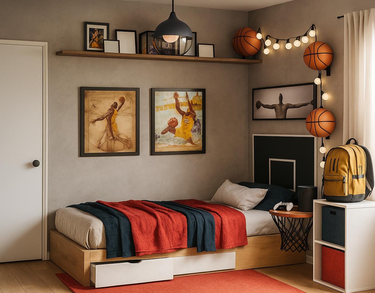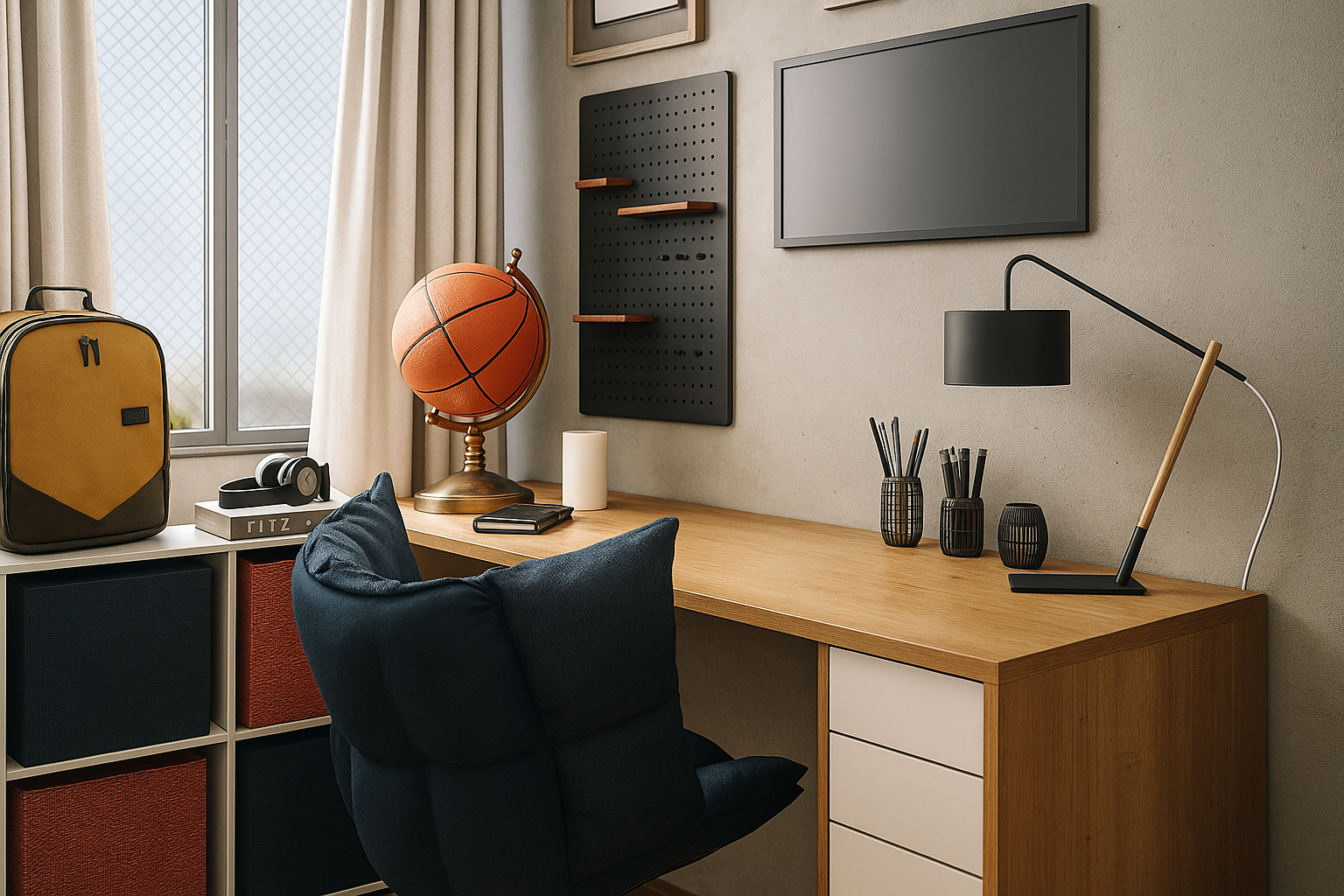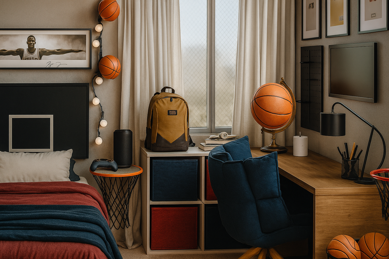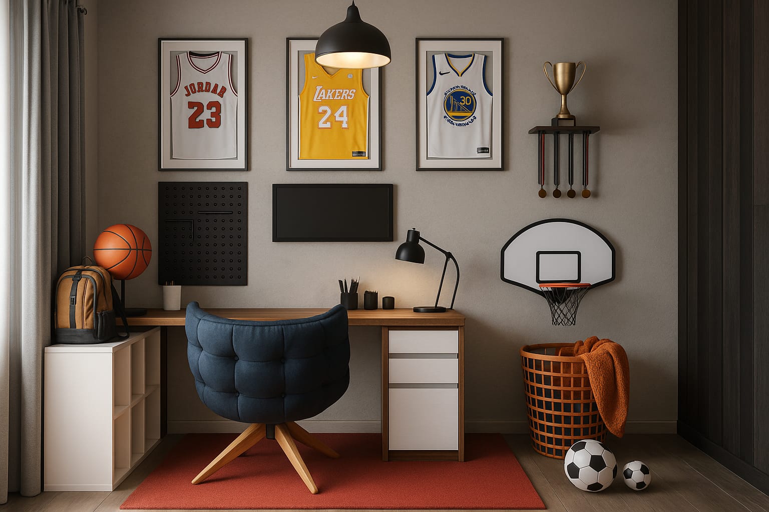 Proyecto de diseño interior de una recámara pensada para acompañar la transición de la infancia a la adolescencia. El espacio se concibe como un entorno funcional y equilibrado, capaz de evolucionar con el crecimiento del usuario y reflejar su identidad personal y sus intereses. El diseño integra de manera sutil la pasión por el baloncesto, tanto dentro como fuera de la cancha, evitando recursos temáticos evidentes y privilegiando una lectura más atemporal. La selección de tonalidades cálidas contribuye a generar un ambiente propicio para la concentración, el descanso y el uso cotidiano del espacio. La recámara se organiza incorporando un área de estudio cómoda y bien iluminada, así como elementos decorativos vinculados al deporte, integrados de forma armónica al conjunto. La iluminación cálida refuerza la sensación de confort y favorece una atmósfera acogedora sin sacrificar funcionalidad. Conceptos: Diseño interior · Recámara juvenil · Espacios en transición · Identidad · Funcionalidad
